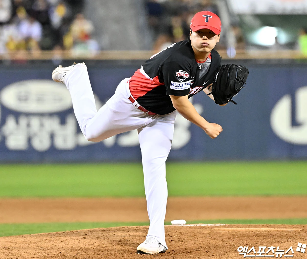 (엑스포츠뉴스 잠실, 김한준 기자) 17일 오후 서울 송파구 잠실야구장에서 열린 '2026 신한 SOL Bank KBO리그' KIA 타이거즈와 두산 베어스의 경기, 7회말 KIA 황동하가 공을 힘차게 던지고 있다.