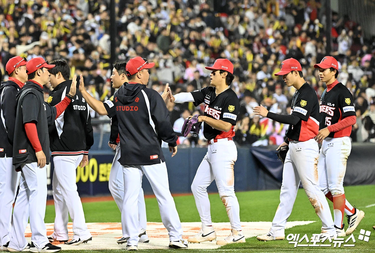 이날 경기에서 승리한 KIA 이범호 감독이 선수들과 하이파이브를 하고 있다.