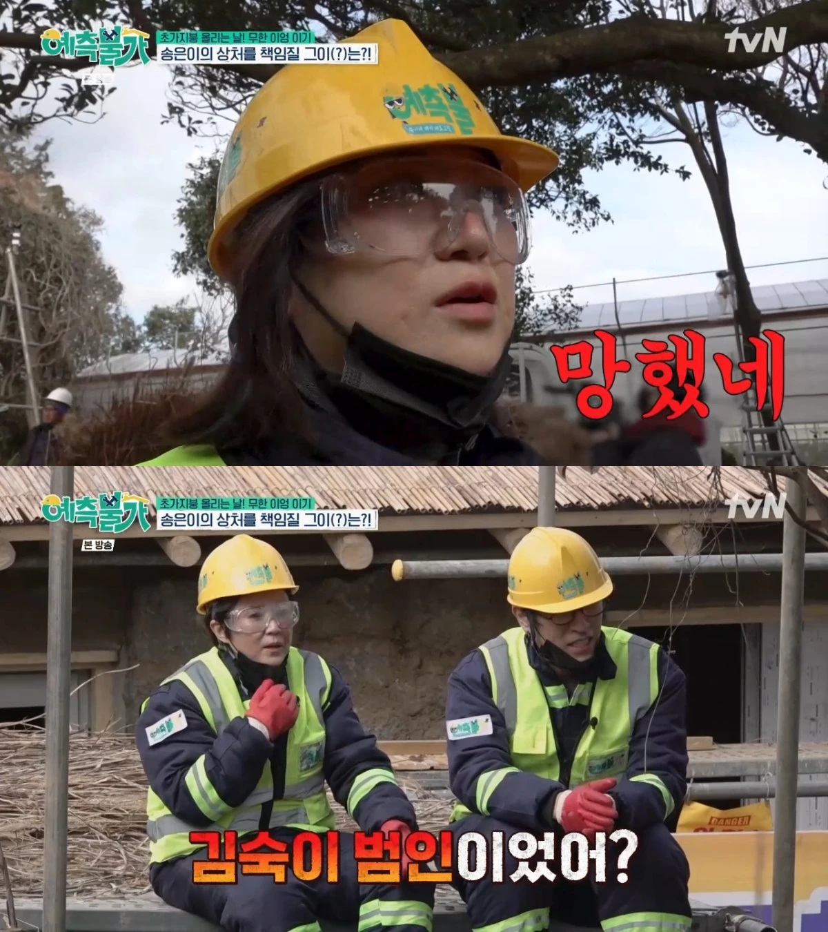 (엑스포츠뉴스 황수연 기자) 송은이가 초가지붕 작업을 하다가 얼굴에 상처가 났다.