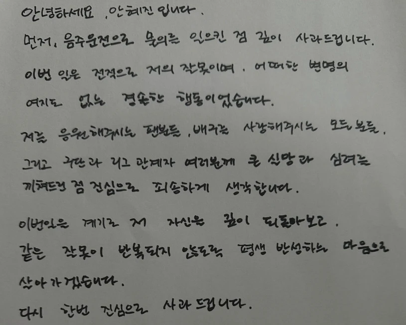 이어 "이번 일을 계기로 자신을 깊이 되돌아보고, 같은 잘못이 반복되지 않도록 평생 반성하는 마음으로 살아가겠다"고 밝혔다.