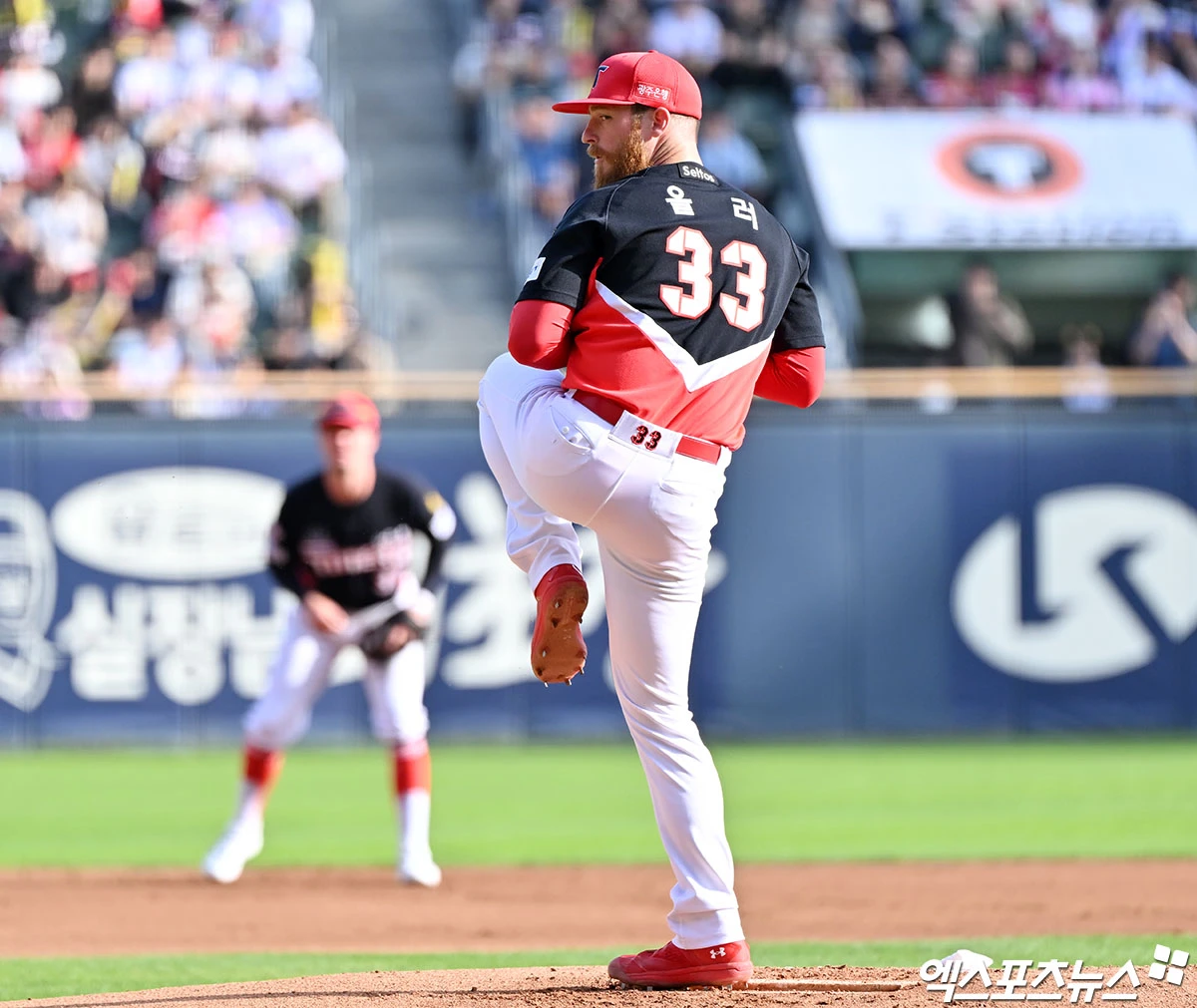 (엑스포츠뉴스 잠실, 김한준 기자) 18일 오후 서울 송파구 잠실야구장에서 열린 '2026 신한 SOL Bank KBO리그' KIA 타이거즈와 두산 베어스의 경기, 1회말 KIA 선발투수 올러가 공을 힘차게 던지고 있다.