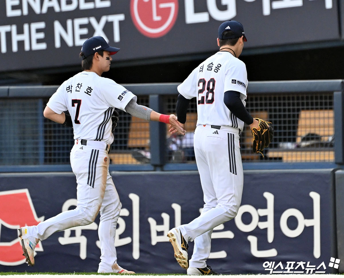 (엑스포츠뉴스 잠실, 김한준 기자) 18일 오후 서울 송파구 잠실야구장에서 열린 '2026 신한 SOL Bank KBO리그' KIA 타이거즈와 두산 베어스의 경기, 3회초 수비를 마친 두산 최승용이 박찬호와 하이파이브를 하고 있다.