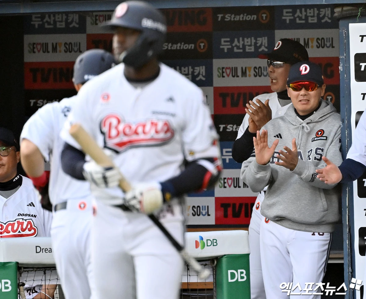 (엑스포츠뉴스 잠실, 김한준 기자) 18일 오후 서울 송파구 잠실야구장에서 열린 '2026 신한 SOL Bank KBO리그' KIA 타이거즈와 두산 베어스의 경기, 3회말 2사 3루 두산 손아섭이 김민석의 1타점 적시타때 득점에 성공하고 있다.