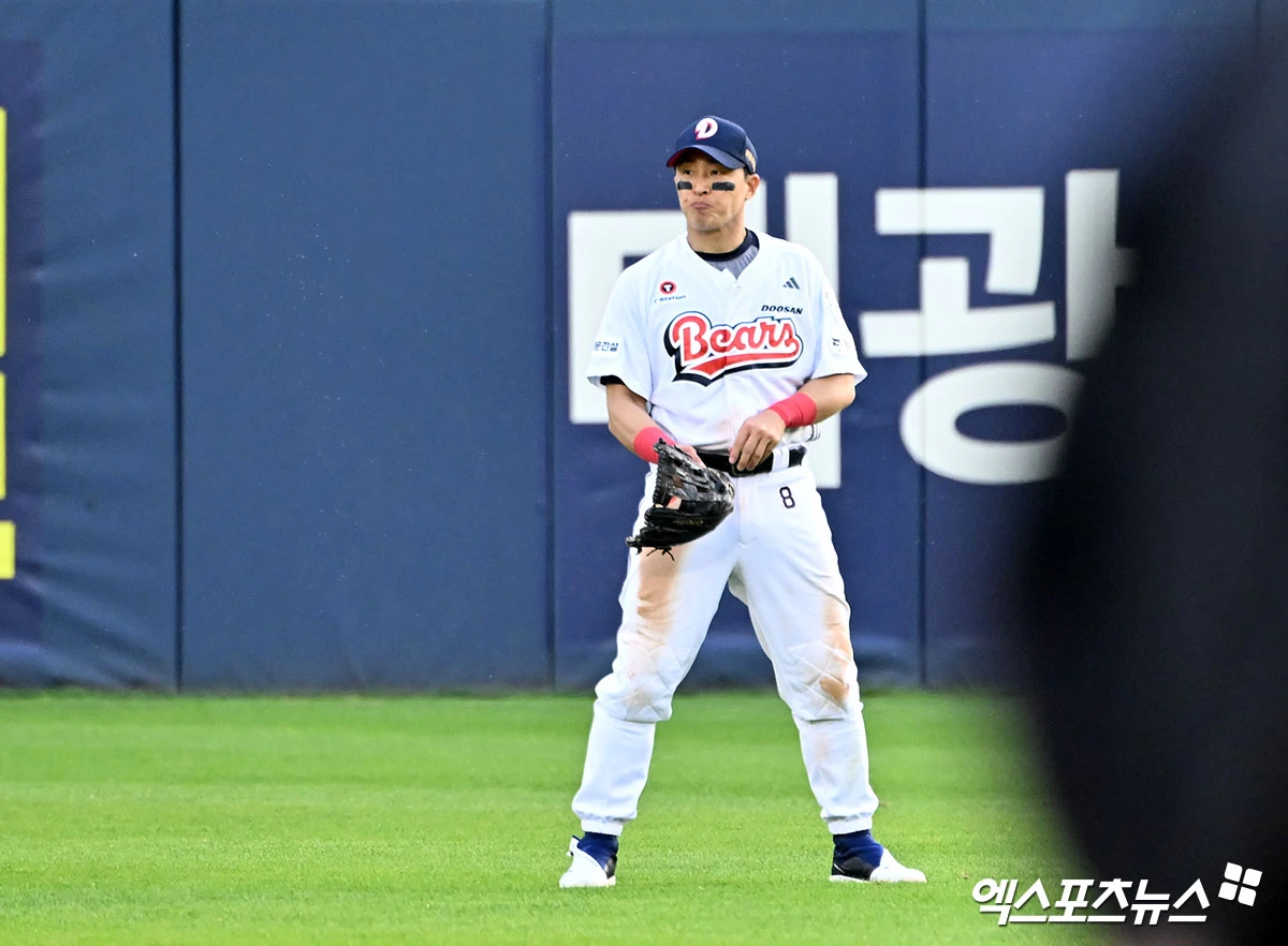 (엑스포츠뉴스 잠실, 김한준 기자) 18일 오후 서울 송파구 잠실야구장에서 열린 '2026 신한 SOL Bank KBO리그' KIA 타이거즈와 두산 베어스의 경기, 5회초 1사 1,2루 두산 손아섭이 타구를 잡았다 놓친 후 아쉬워하고 있다.