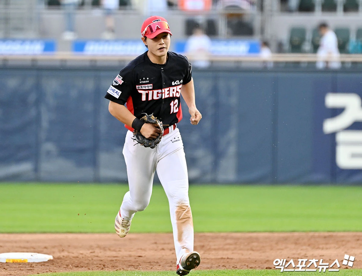 (엑스포츠뉴스 잠실, 김한준 기자) 18일 오후 서울 송파구 잠실야구장에서 열린 '2026 신한 SOL Bank KBO리그' KIA 타이거즈와 두산 베어스의 경기, 5회말 2사 KIA 정현창이 두산 양의지의 타구를 처리하고 있다.