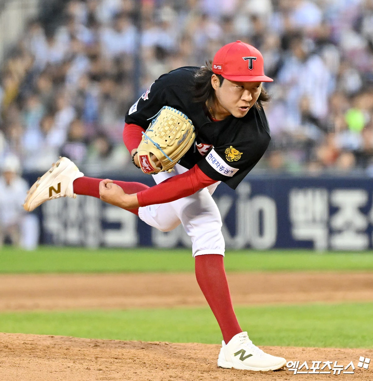 (엑스포츠뉴스 잠실, 김한준 기자) 18일 오후 서울 송파구 잠실야구장에서 열린 '2026 신한 SOL Bank KBO리그' KIA 타이거즈와 두산 베어스의 경기, 7회말 1사 2루 KIA 김범수가 공을 힘차게 던지고 있다.