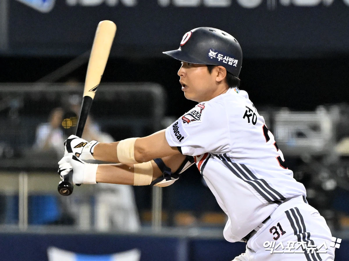 (엑스포츠뉴스 잠실, 김한준 기자) 18일 오후 서울 송파구 잠실야구장에서 열린 '2026 신한 SOL Bank KBO리그' KIA 타이거즈와 두산 베어스의 경기, 8회말 2사 1,3루 두산 정수빈이 1타점 적시타를 날리고 있다.