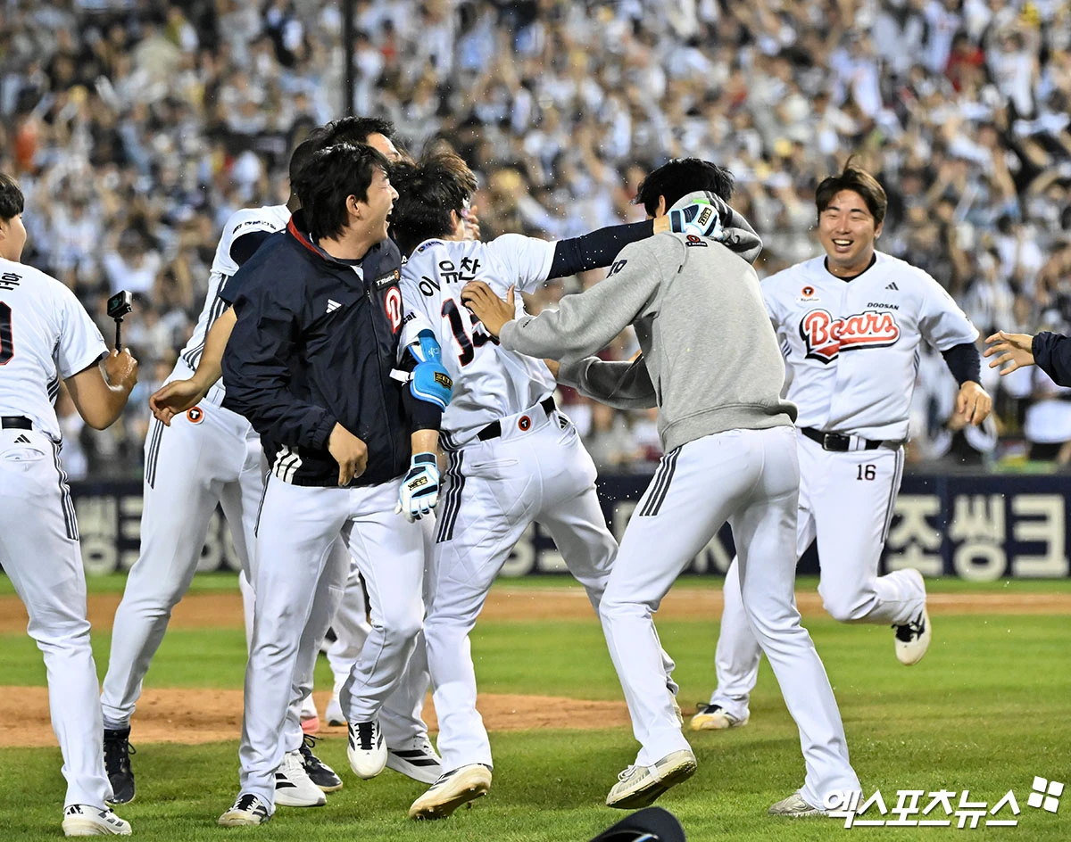10회말 1사 1,2루 두산 이유찬이 끝내기 안타를 날린 후 기뻐하고 있다.