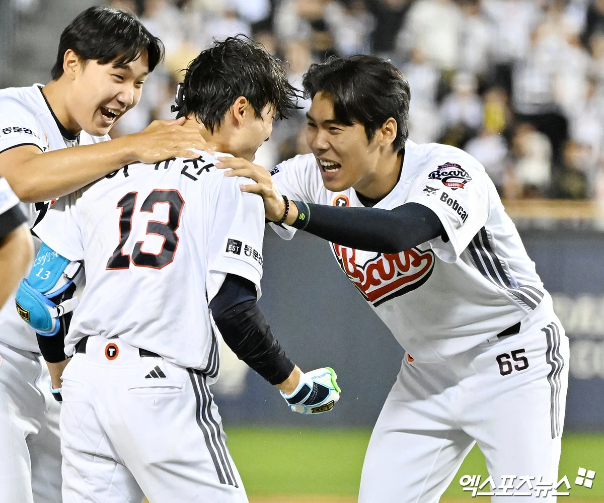 이날 경기에서 승리한 두산 이유찬과 윤태호가 기뻐하고 있다.