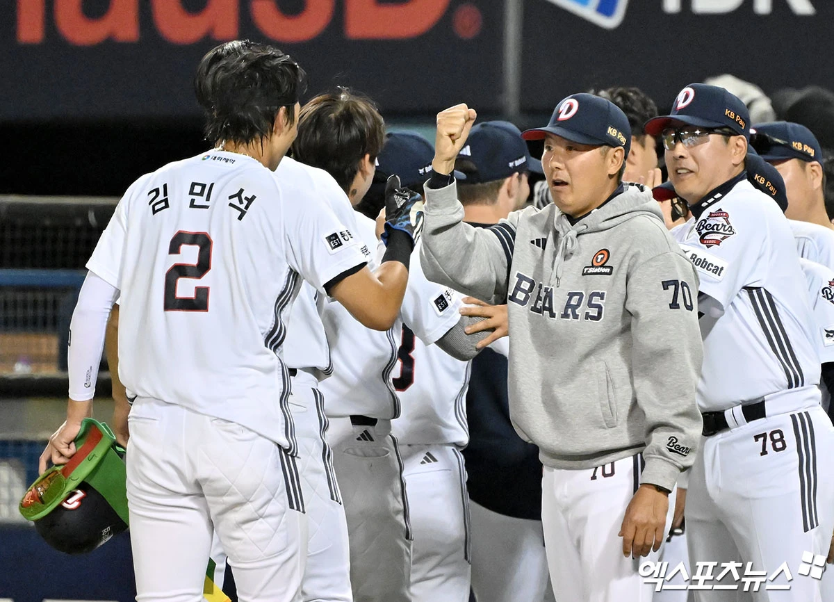 경기종료 후 두산 김원형 감독이 선수들과 하이파이브를 하고 있다.