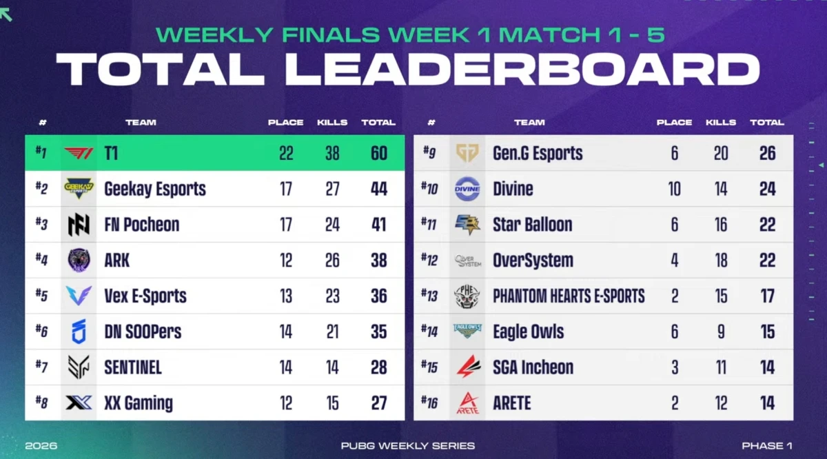 (엑스포츠뉴스 이정범 기자) '2026 PWS: 페이즈 1' T1이 1주 차 '위클리 파이널' 1일 차 1위에 올랐다.