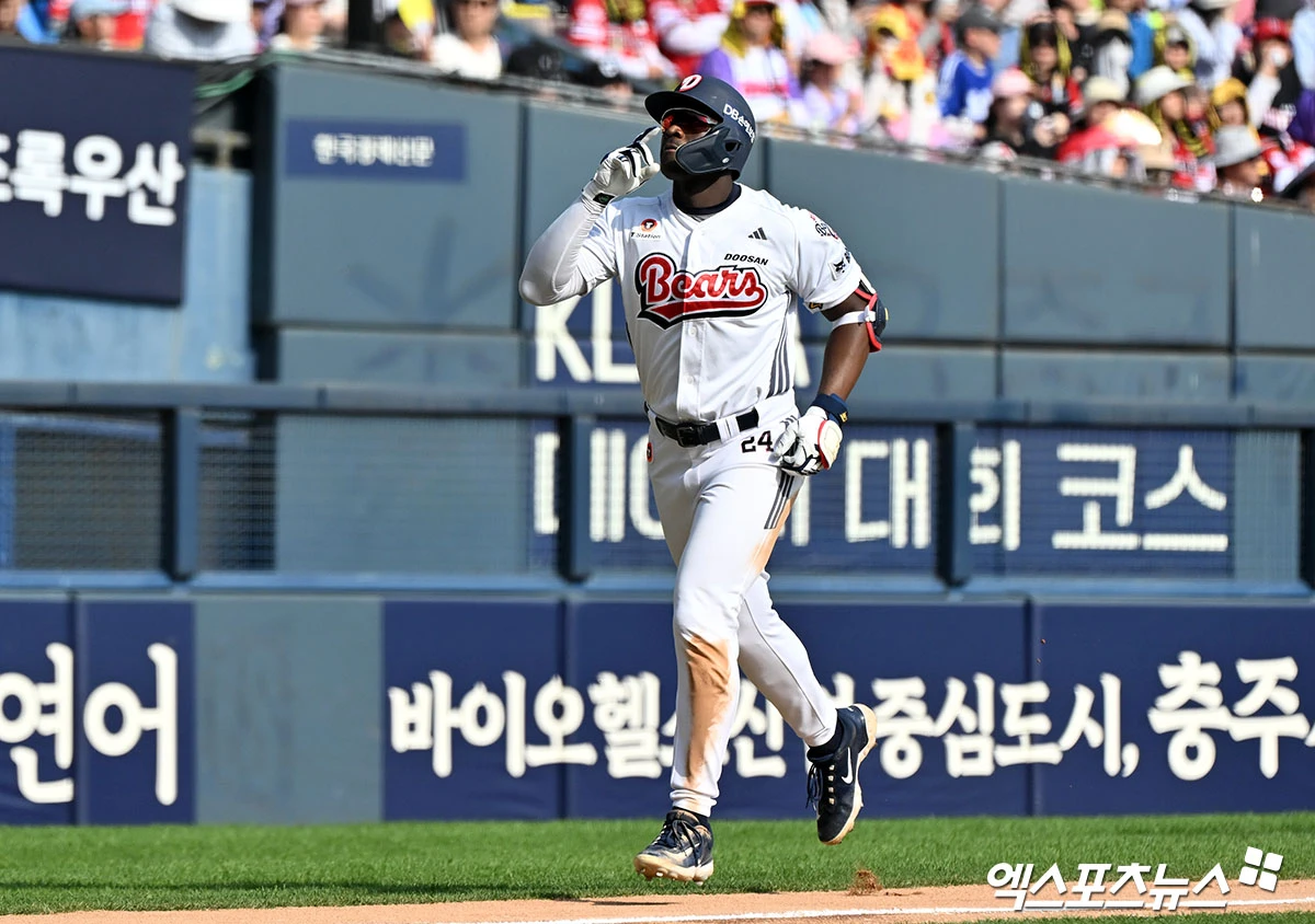 (엑스포츠뉴스 잠실, 김한준 기자) 19일 오후 서울 송파구 잠실야구장에서 열린 '2026 신한 SOL Bank KBO리그' KIA 타이거즈와 두산 베어스의 경기, 6회말 두산 카메론이 솔로 홈런을 날린 후 기뻐하고 있다.
