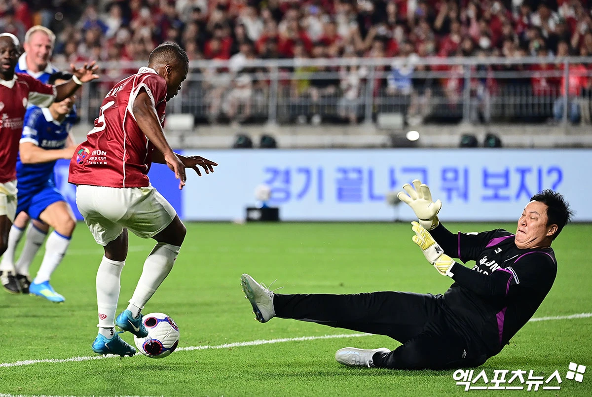 (엑스포츠뉴스 수원, 박지영 기자) 19일 오후 수원월드컵경기장에서 열린 'OGFC vs 수원 삼성 레전드 매치(OGFC: THE LEGENDS ARE BACK)', 수원 이운재가 OGFC 에브라의 슈팅을 수비하고 있다.