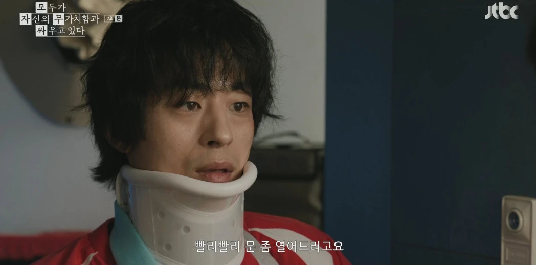 19일 방송된 JTBC 토일드라마 '모두가 자신의 무가치함과 싸우고 있다'(이하 '모자무싸')에서는 20년째 영화감독을 꿈꾸는 황동만(구교환 분)의 씁쓸한 일상이 그려졌다.
