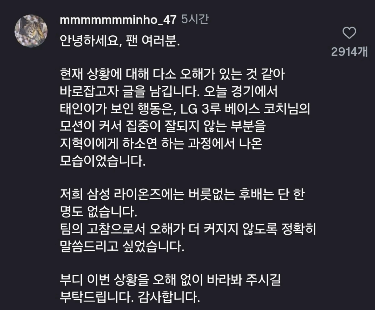 이어 "저희 삼성 라이온즈에는 버릇없는 후배는 단 한 명도 없습니다. 팀의 고참으로서 오해가 더 커지지 않도록 정확히 말씀드리고 싶었습니다"라며 "부디 이번 상황을 오해 없이 바라봐 주시길 부탁드립니다"라고 덧붙였다.