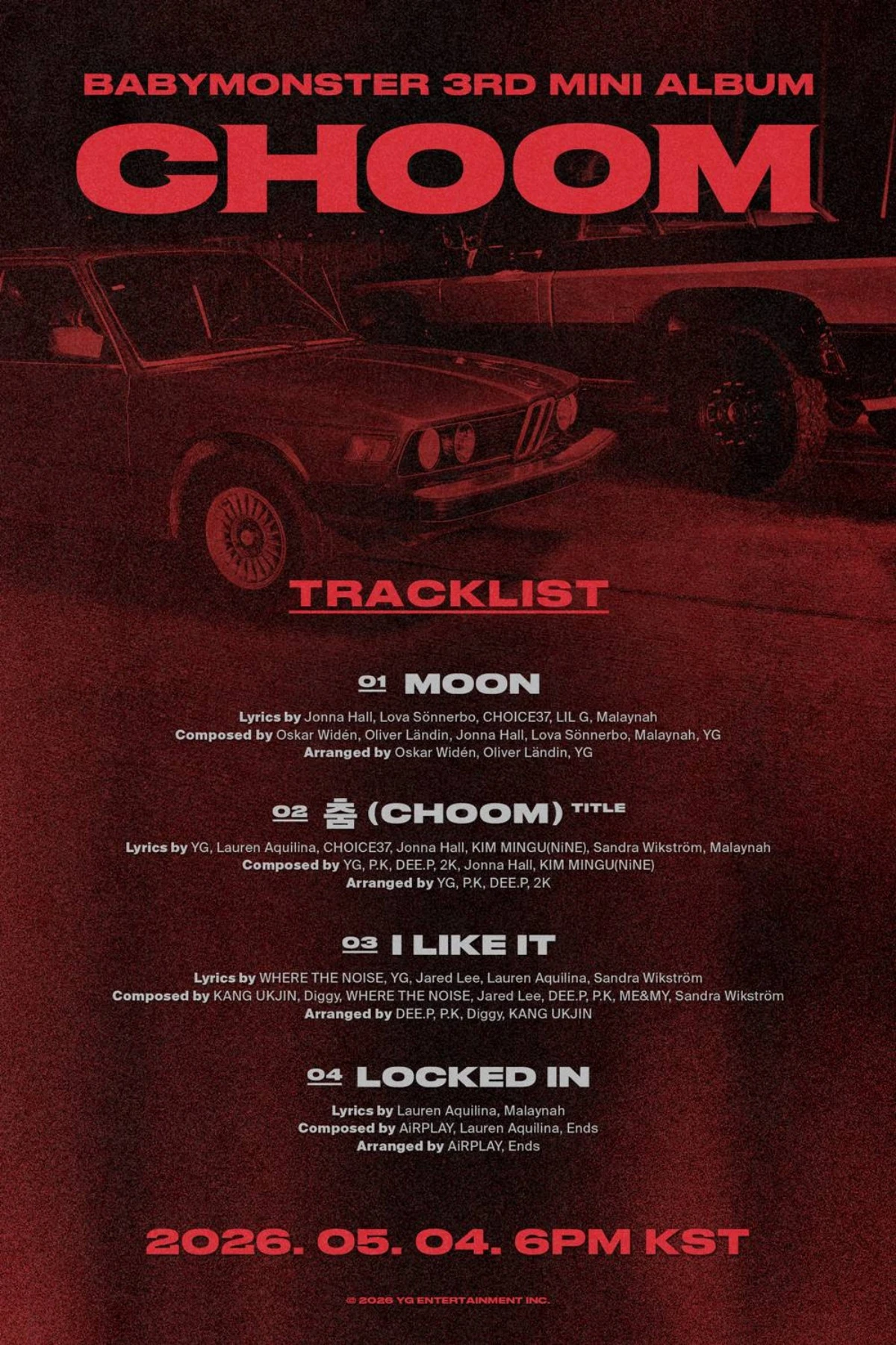 20일 YG엔터테인먼트에 따르면 베이비몬스터의 미니 3집 '춤 (CHOOM)'에는 첫 번째 트랙 'MOON'을 시작으로 타이틀곡 '춤 (CHOOM)', 'I LIKE IT', 'LOCKED IN'까지 총 4개의 신곡이 담겼다.