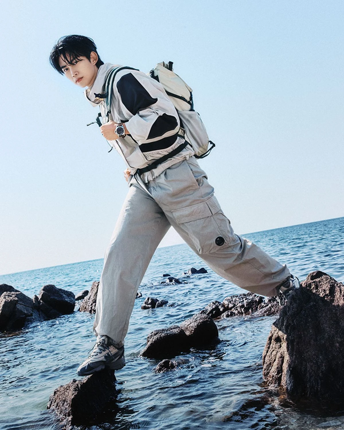 그는 거대한 암석 바위를 포함한 자연의 거친 아우라 속에서도 흔들림 없는 눈빛을 보내며 강렬한 존재감을 뽐냈다. 더불어 특유의 밀도 높은 표정 구사와 웨트 헤어스타일로 한층 더 야생적인 분위기를 완성한 것. 또한 독보적인 피지컬로 다양한 고프코어룩을 완벽 소화해 옴므파탈의 매력을 가감 없이 드러냈다.