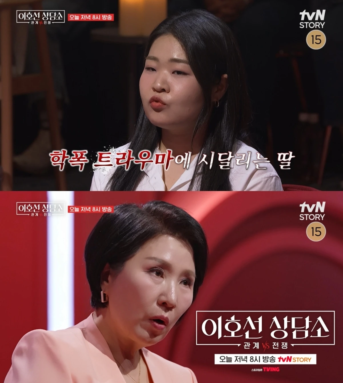 21일 방송되는 tvN STORY ‘이호선 상담소’ 14회는 데이트 폭력 강연을 시작으로 유년 시절 목격한 폭력의 기억을 안고 사는 아내, 그리고 학교 폭력의 상처로 인해 생의 의지까지 잃어버린 딸의 사연을 다루며 ‘폭력’이 남긴 트라우마를 치유하는 과정을 담아낸다.