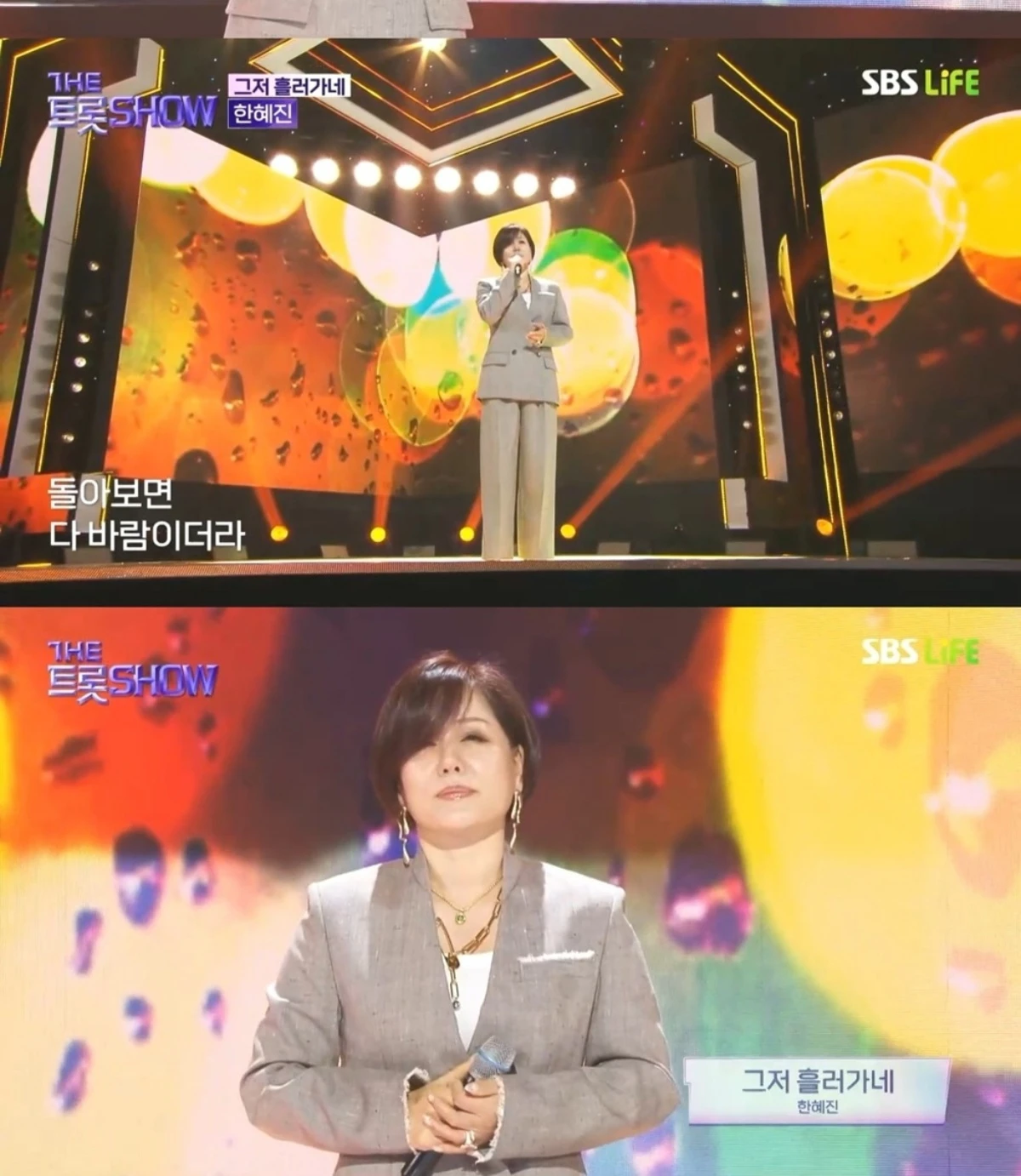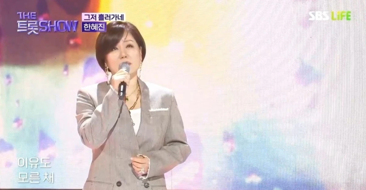한혜진은 지난 20일 방송된 SBS Life '더트롯쇼'에 출연해 신곡 '그저 흘러가네'로 무대를 꾸몄다. 그레이 톤의 캐주얼 정장을 입고 무대에 오른 한혜진은 특유의 허스키한 보이스로 흘러간 세월을 노래하며 듣는 이들의 공감과 감동을 이끌어냈다.