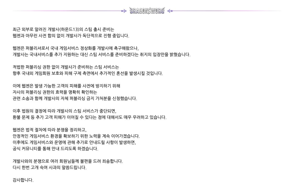 웹젠은 21일 드래곤소드 공식 커뮤니티 공지를 통해 하운드13을 상대로 본안 소송과 가처분을 신청했다고 밝혔다. 웹젠은 "외부로 알려진 개발사의 스팀 출시 준비는 웹젠과 어떠한 사전 합의 없이 개발사가 독단적으로 진행 중인 사안"이라며 "적법한 퍼블리싱 권한 없이 준비되는 스팀 서비스는 향후 국내외 게임 회원 보호와 피해 구제 측면에서 추가적인 혼선을 일으킬 것"이라고 법적 대응 배경을 설명했다.
