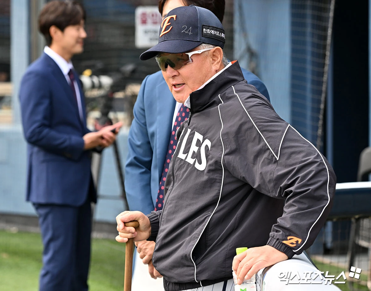 (엑스포츠뉴스 잠실, 김한준 기자) 21일 오후 서울 송파구 잠실야구장에서 열리는 '2026 신한 SOL Bank KBO리그' 한화 이글스와 LG 트윈스의 경기, 한화 김경문 감독이 선수들의 훈련을 지켜보고 있다.