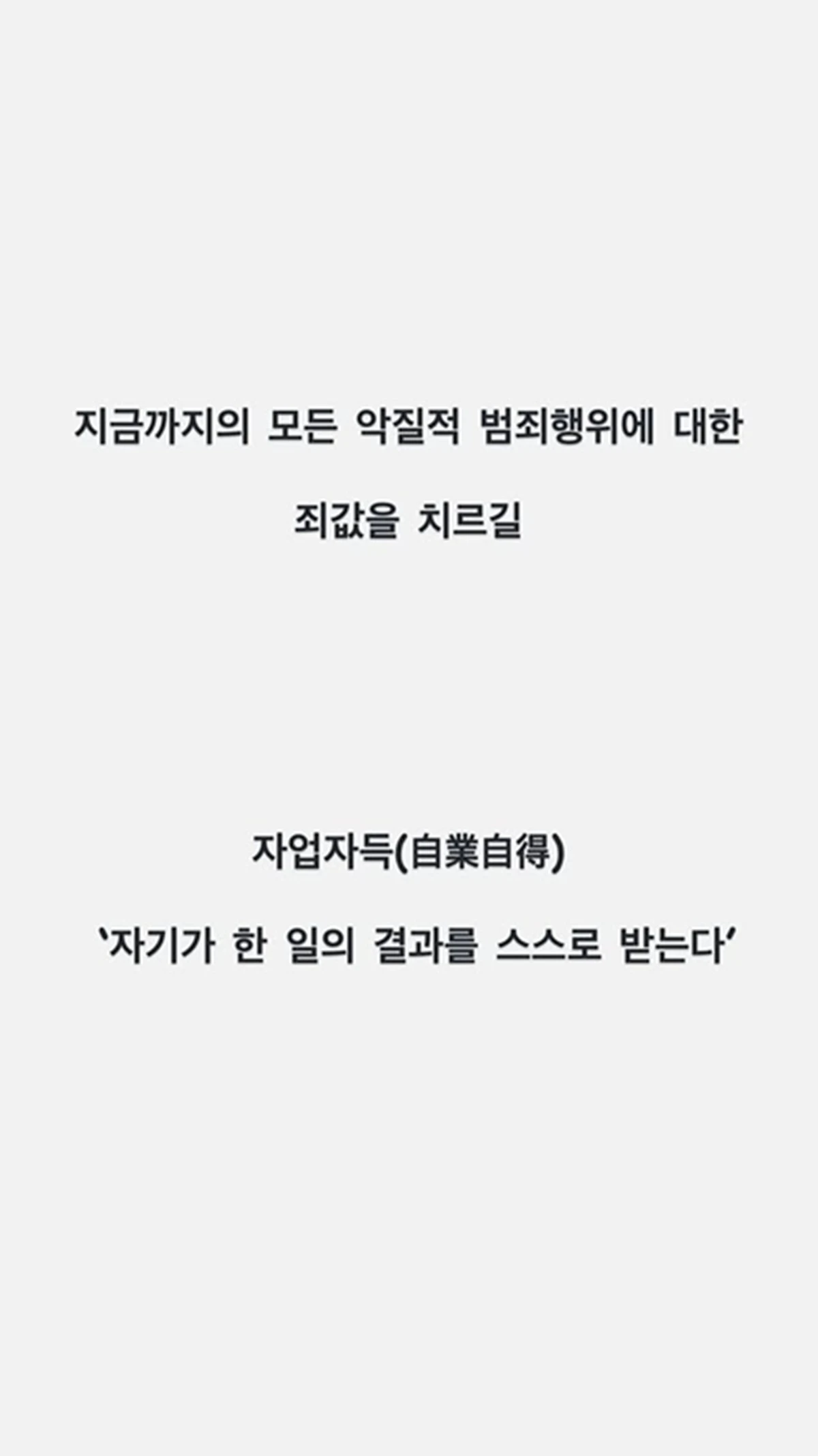 21일 오후 나나는 자신의 개인 채널에 "지금까지의 모든 악질적 범죄 행위에 대한 죄값을 치르길"이라는 글과 함께 '자기가 한 일의 결과를 스스로 받는다'는 뜻의 사자성어인 자업자득 글귀를 게재했다.