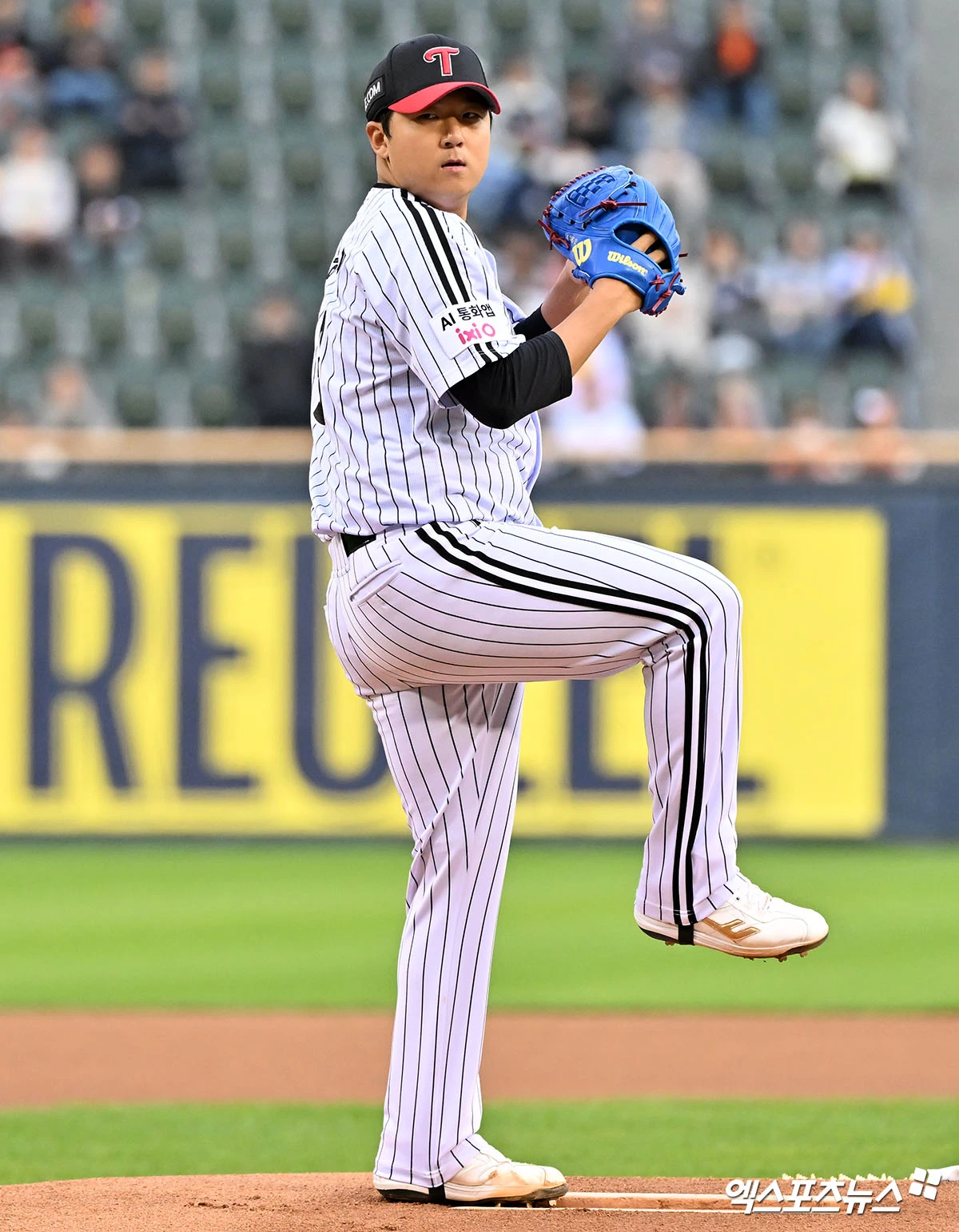 (엑스포츠뉴스 잠실, 김한준 기자) 21일 오후 서울 송파구 잠실야구장에서 열린 '2026 신한 SOL Bank KBO리그' 한화 이글스와 LG 트윈스의 경기, 1회초 LG 선발투수 송승기가 공을 힘차게 던지고 있다.