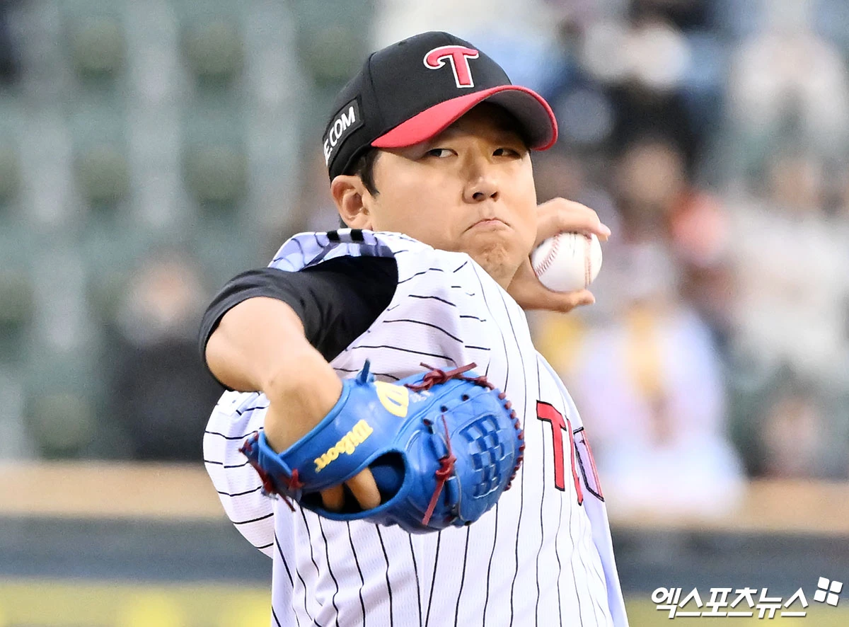 (엑스포츠뉴스 잠실, 김한준 기자) 21일 오후 서울 송파구 잠실야구장에서 열린 '2026 신한 SOL Bank KBO리그' 한화 이글스와 LG 트윈스의 경기, 1회초 LG 선발투수 송승기가 공을 힘차게 던지고 있다.