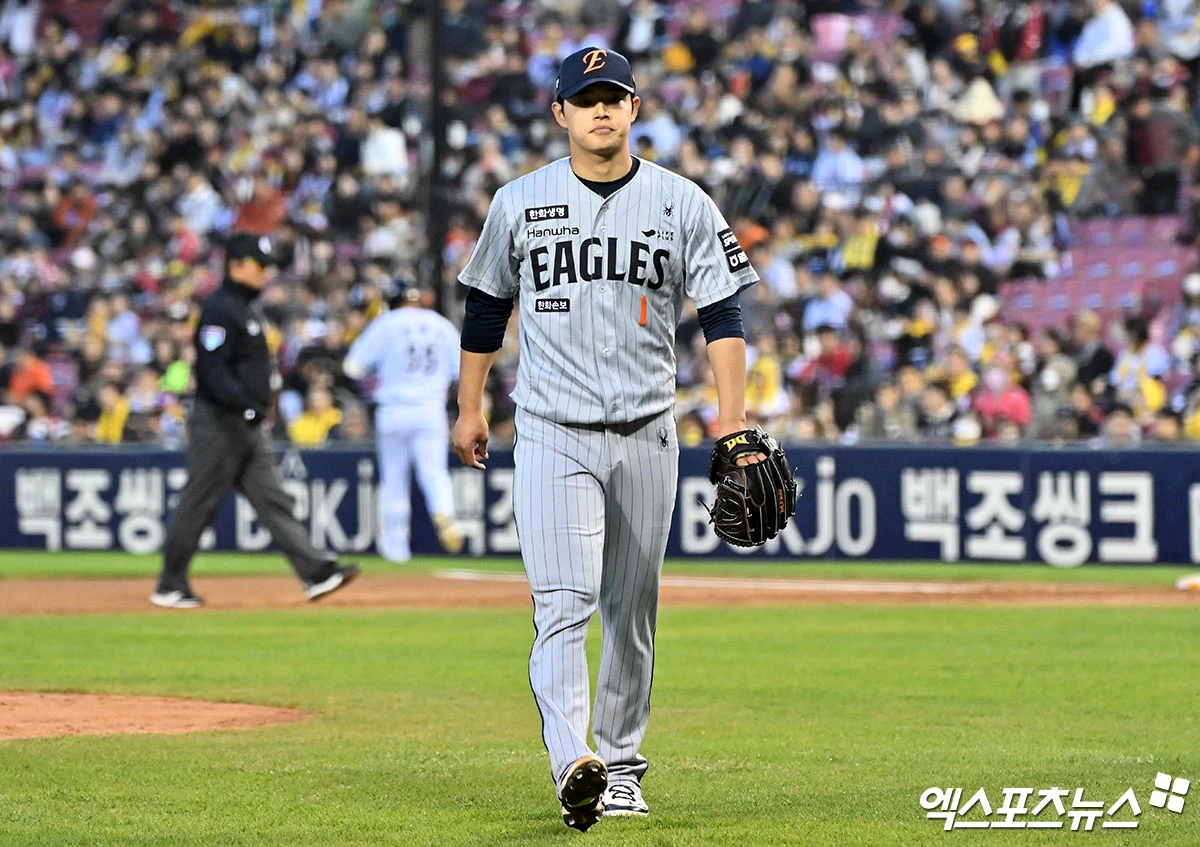 (엑스포츠뉴스 잠실, 김한준 기자) 21일 오후 서울 송파구 잠실야구장에서 열린 '2026 신한 SOL Bank KBO리그' 한화 이글스와 LG 트윈스의 경기, 2회말 수비를 마친 한화 문동주가 더그아웃으로 향하고 있다.