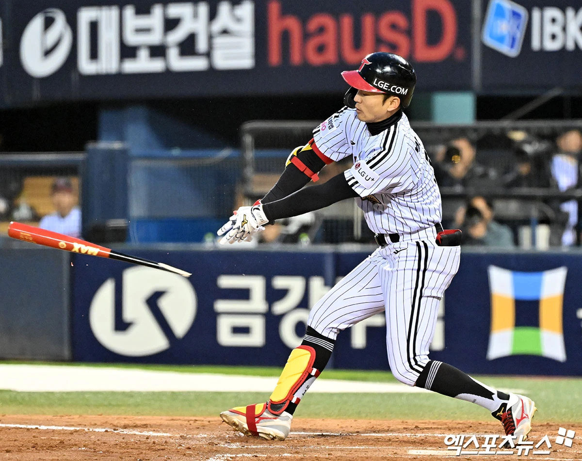 (엑스포츠뉴스 잠실, 김한준 기자) 21일 오후 서울 송파구 잠실야구장에서 열린 '2026 신한 SOL Bank KBO리그' 한화 이글스와 LG 트윈스의 경기, 3회말 2사 LG 박해민이 타격을 하고 있다. 결과는 3루수 땅볼 아웃.