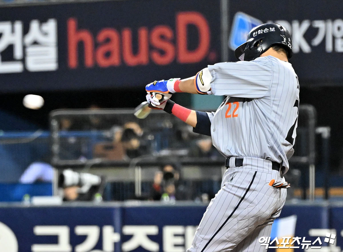 (엑스포츠뉴스 잠실, 김한준 기자) 21일 오후 서울 송파구 잠실야구장에서 열린 '2026 신한 SOL Bank KBO리그' 한화 이글스와 LG 트윈스의 경기, 4회초 1사 한화 채은성이 우중간 안타를 날리고 있다.