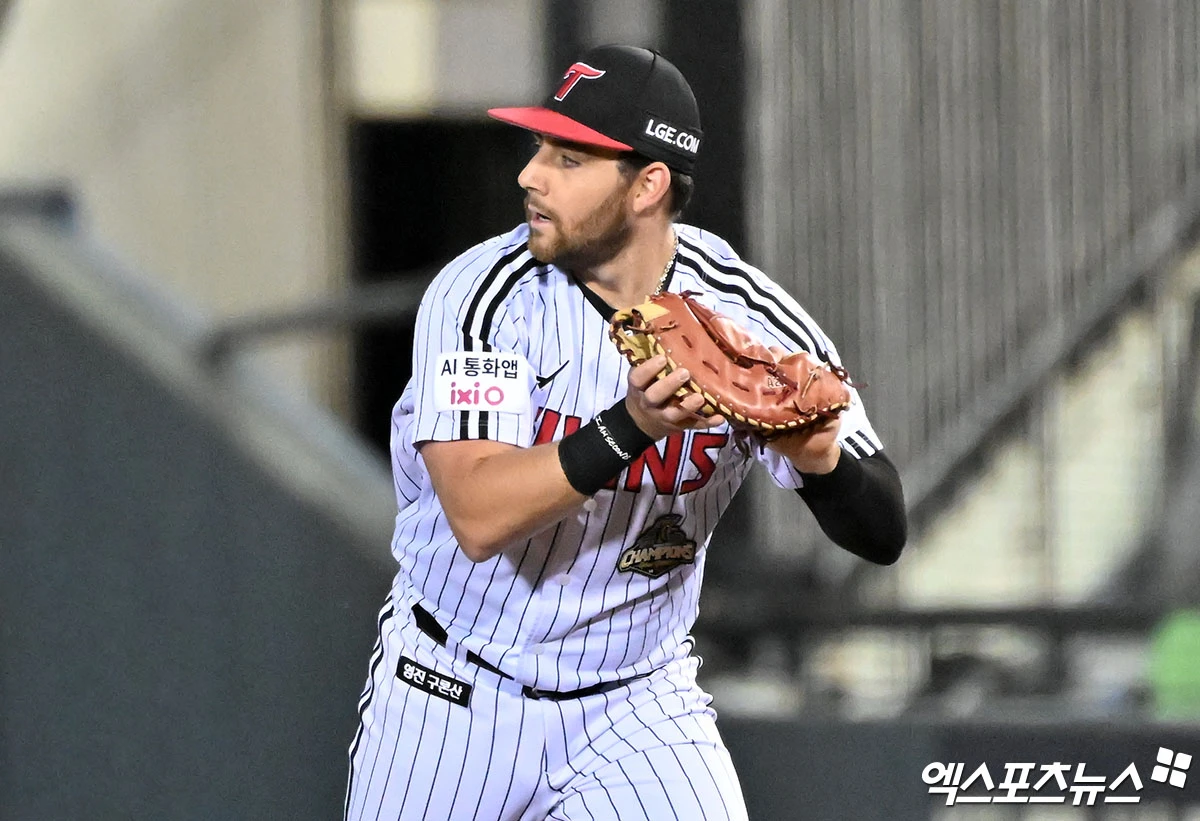 (엑스포츠뉴스 잠실, 김한준 기자) 21일 오후 서울 송파구 잠실야구장에서 열린 '2026 신한 SOL Bank KBO리그' 한화 이글스와 LG 트윈스의 경기, 4회초 2사 1,3루 LG 오스틴이 한화 최재훈의 타구를 잡고 있다.