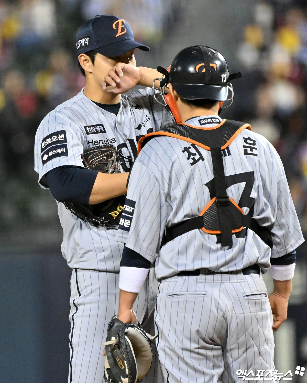 (엑스포츠뉴스 잠실, 김한준 기자) 21일 오후 서울 송파구 잠실야구장에서 열린 '2026 신한 SOL Bank KBO리그' 한화 이글스와 LG 트윈스의 경기, 4회말 1사 1,2루 한화 최재훈이 마운드를 방문해 문동주와 대화를 나누고 있다.