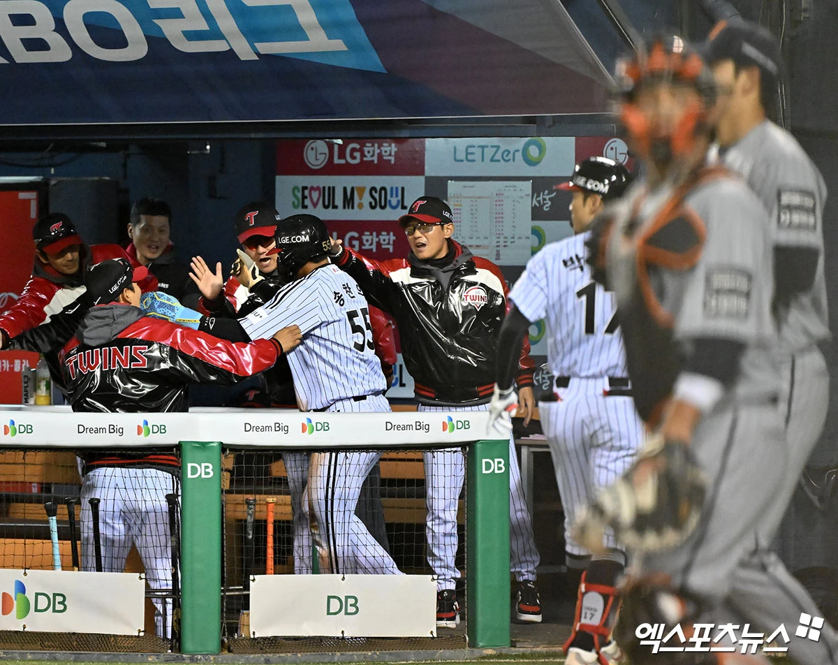 (엑스포츠뉴스 잠실, 김한준 기자) 21일 오후 서울 송파구 잠실야구장에서 열린 '2026 신한 SOL Bank KBO리그' 한화 이글스와 LG 트윈스의 경기, 4회말 2사 2루 LG 송찬의가 신민재의 1타점 적시타때 득점에 성공하고 있다.