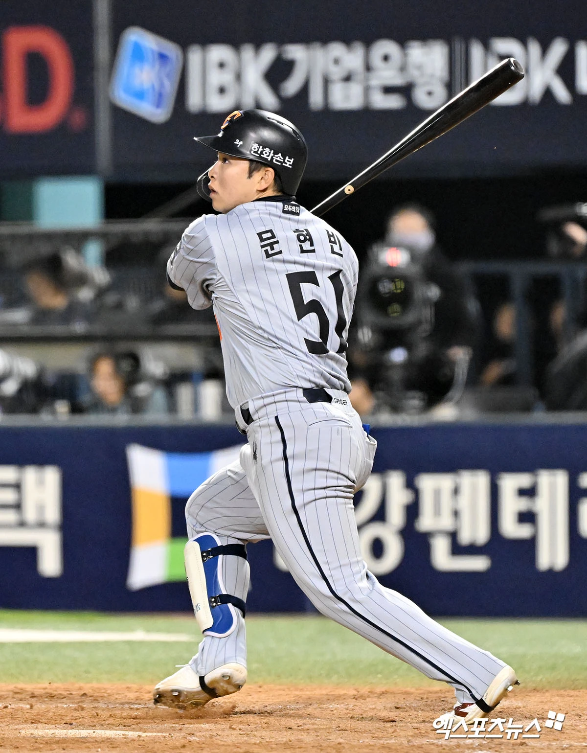 (엑스포츠뉴스 잠실, 김한준 기자) 21일 오후 서울 송파구 잠실야구장에서 열린 '2026 신한 SOL Bank KBO리그' 한화 이글스와 LG 트윈스의 경기, 5회초 2사 2루 한화 문현빈이 1타점 3루타를 날리고 있다.