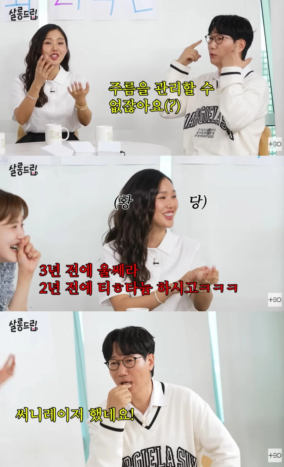 그는 "다운타임 알지 않나. 레이저 시술을 받고 붓기와 시술 티가 얼마나 가는지를 말하는 거다. 모르냐. 너희 열심히 안 산다"고 장도연과 미미를 지적한 후 "다운 타임이 길어서 그때 시술을 못했다"고 이야기했다.