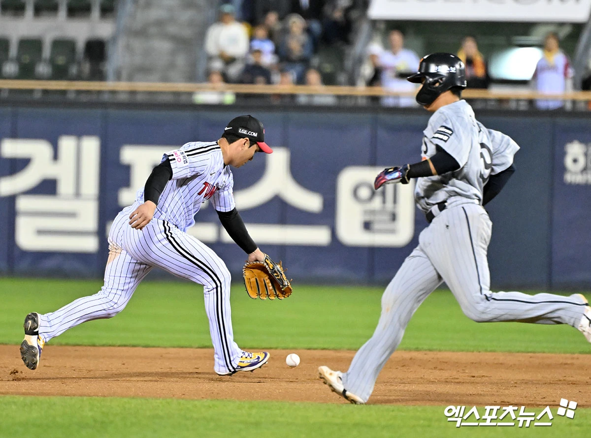 (엑스포츠뉴스 잠실, 김한준 기자) 21일 오후 서울 송파구 잠실야구장에서 열린 '2026 신한 SOL Bank KBO리그' 한화 이글스와 LG 트윈스의 경기, 7회초 1사 1루 LG 오지환이 포구 실책을 하고 있다.