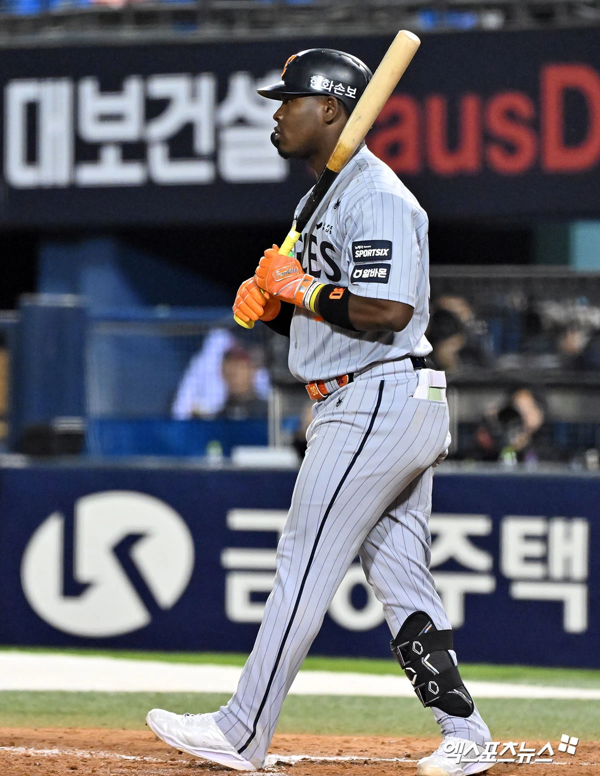 (엑스포츠뉴스 잠실, 김한준 기자) 21일 오후 서울 송파구 잠실야구장에서 열린 '2026 신한 SOL Bank KBO리그' 한화 이글스와 LG 트윈스의 경기, 7회초 1사 1,2루 한화 페라자가 볼넷으로 출루하고 있다.