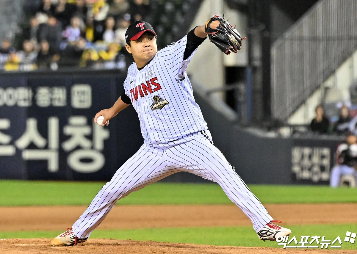 (엑스포츠뉴스 잠실, 김한준 기자) 21일 오후 서울 송파구 잠실야구장에서 열린 '2026 신한 SOL Bank KBO리그' 한화 이글스와 LG 트윈스의 경기, 7회초 1사 만루 LG 장현식이 공을 힘차게 던지고 있다.