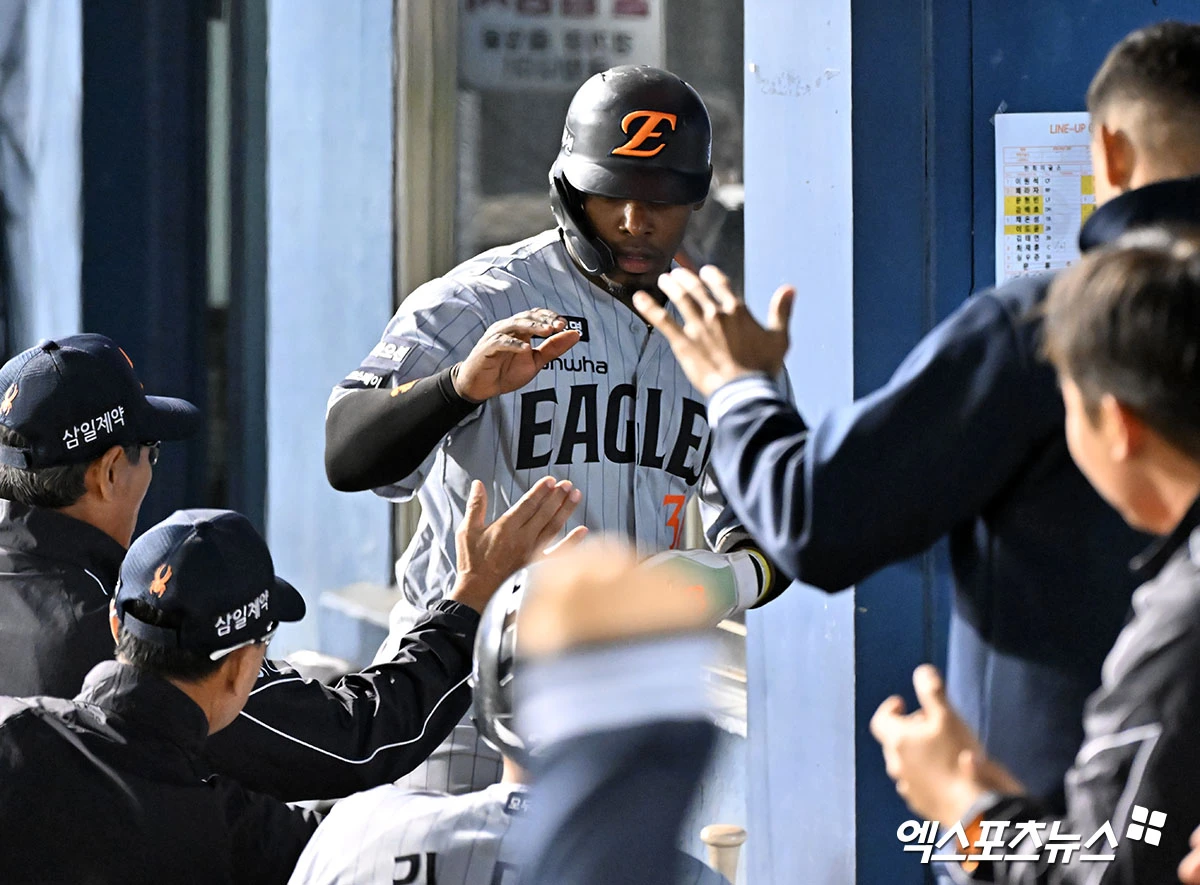(엑스포츠뉴스 잠실, 김한준 기자) 21일 오후 서울 송파구 잠실야구장에서 열린 '2026 신한 SOL Bank KBO리그' 한화 이글스와 LG 트윈스의 경기, 7회초 2사 2,3루 한화 페라자가 채은성의 2타점 적시타때 득점에 성공하고 있다.