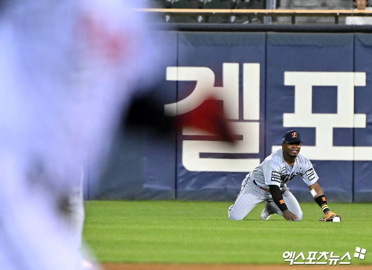 (엑스포츠뉴스 잠실, 김한준 기자) 21일 오후 서울 송파구 잠실야구장에서 열린 '2026 신한 SOL Bank KBO리그' 한화 이글스와 LG 트윈스의 경기, 7회말 2사 2루 한화 페라자가 LG 오스틴의 타구를 위해 다이빙 캐치를 시도하고 있다.