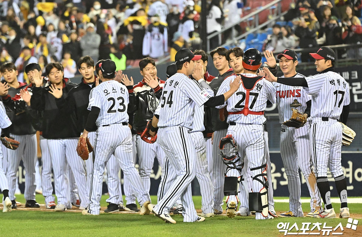 이날 경기에서 승리한 LG 선수들이 기뻐하고 있다.