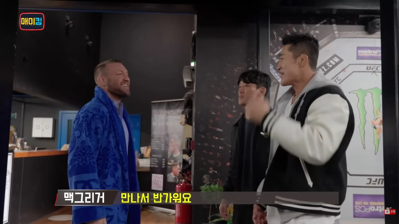 카바나 코치의 부름에 윗층에서 내려와 체육관에 모습을 드러낸 맥그리거는 김동현에게 반갑게 인사를 건넸고, 김동현 역시 예상치 못한 만남에 놀라면서도 곧바로 화답했다.
