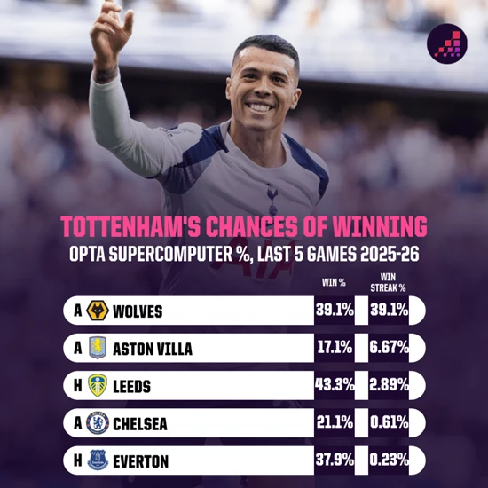 확률은 절망적이다. 옵타 슈퍼컴퓨터가 시즌 남은 일정을 1만 번 시뮬레이션한 결과, 토트넘이 남은 5경기를 모두 이길 확률은 0.23%에 불과했다. 사실상 불가능에 가까운 숫자다.