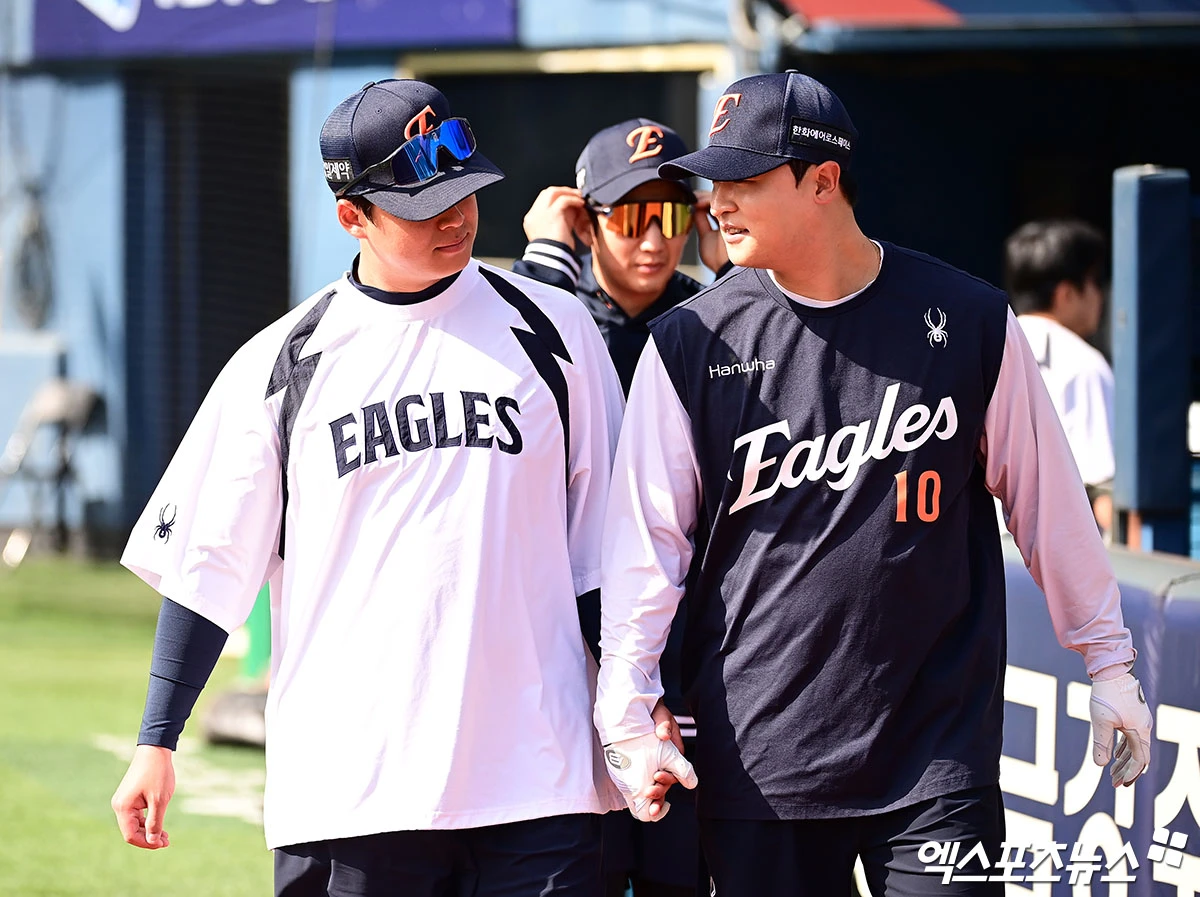 (엑스포츠뉴스 잠실, 박지영 기자) 22일 오후 서울 송파구 잠실야구장에서 열리는 '2026 신한 SOL Bank KBO리그' 한화 이글스와 LG 트윈스의 경기에 앞서 한화 노시환과 이진영이 웜업을 위해 그라운드로 나서고 있다.