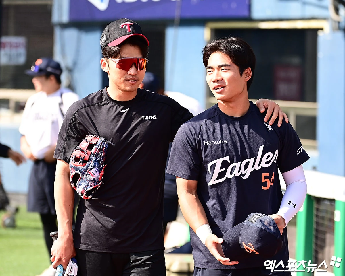 (엑스포츠뉴스 잠실, 박지영 기자) 22일 오후 서울 송파구 잠실야구장에서 열리는 '2026 신한 SOL Bank KBO리그' 한화 이글스와 LG 트윈스의 경기에 앞서 LG 박해민과 한화 오재원이 인사를 나누고 있다.