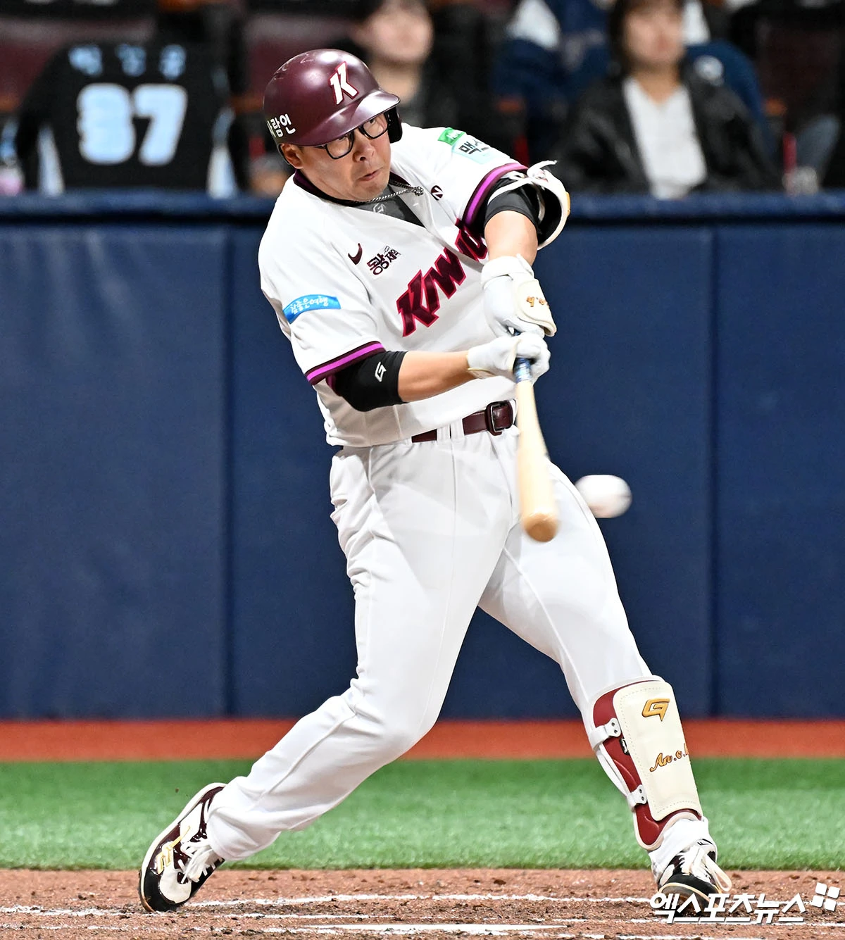 (엑스포츠뉴스 고척, 김한준 기자) 22일 오후 서울 구로구 고척스카이돔에서 열린 '2026 신한 SOL Bank KBO리그' NC 다이노스와 키움 히어로즈의 경기, 4회말 무사 1루 키움 안치홍이 타격을 하고 있다. 결과는 병살타 아웃.