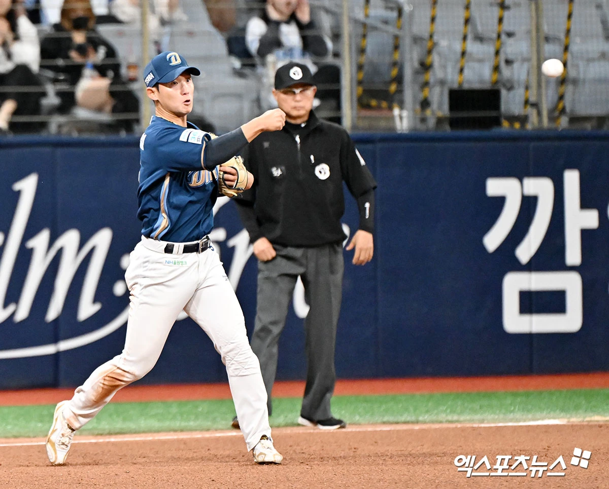 (엑스포츠뉴스 고척, 김한준 기자) 22일 오후 서울 구로구 고척스카이돔에서 열린 '2026 신한 SOL Bank KBO리그' NC 다이노스와 키움 히어로즈의 경기, 4회말 무사 1루 NC 서호철이 키움 안치홍의 타구를 잡아 2루로 송구하고 있다.