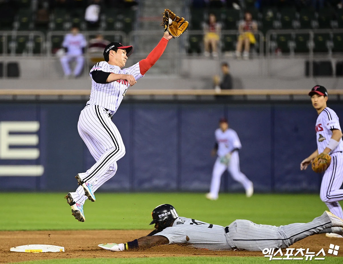 (엑스포츠뉴스 잠실, 박지영 기자) 22일 오후 서울 송파구 잠실야구장에서 열린 '2026 신한 SOL Bank KBO리그' 한화 이글스와 LG 트윈스의 경기, 4회초 1사 1루 한화 문현빈 타석 때 1루주자 페라자가 LG 유격수 오지환의 태그를 피해 2루 도루에 성공하고 있다.