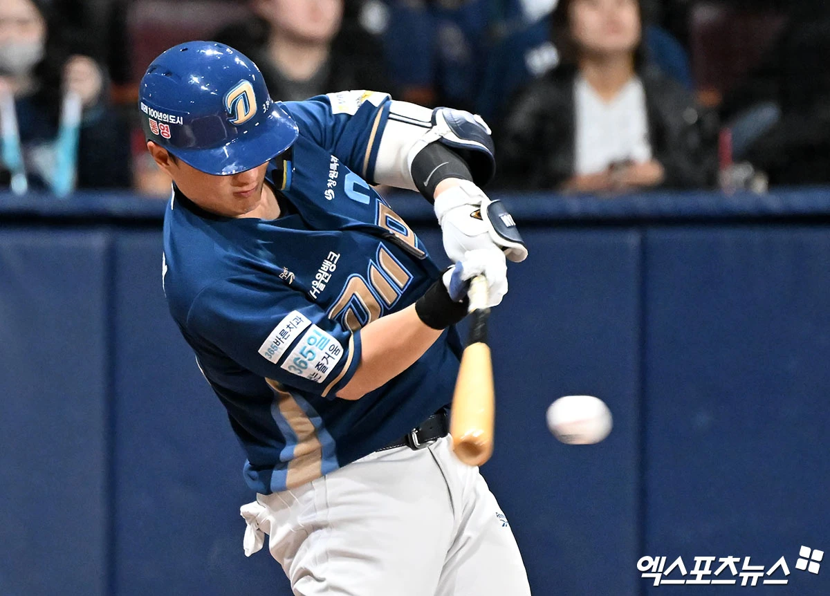 (엑스포츠뉴스 고척, 김한준 기자) 22일 오후 서울 구로구 고척스카이돔에서 열린 '2026 신한 SOL Bank KBO리그' NC 다이노스와 키움 히어로즈의 경기, 5회초 2사 NC 안중열이 좌전안타를 날리고 있다.